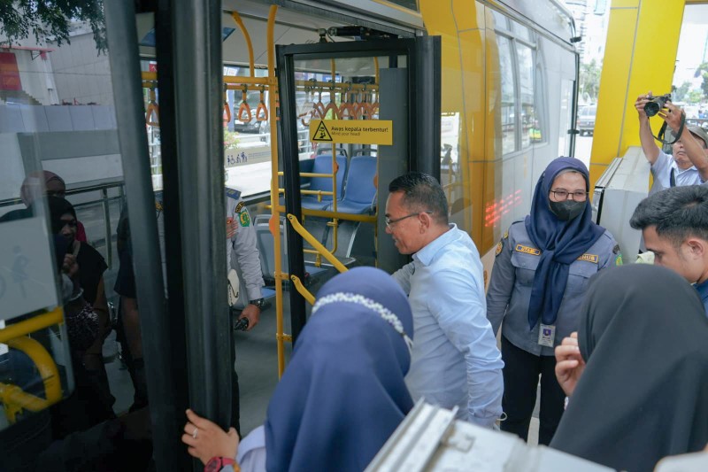 Zakiyuddin menaiki bus listrik dari halte Jalan HM Yamin menuju Balai Kota. Selama perjalanan, Zakiyuddin berbincang hangat dengan masyarakat yang juga menggunakan fasilitas bus listrik.