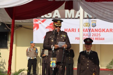 MEDAN | MIMBARRAKYAT.CO.ID – Kapolrestabes Medan, Kombes Pol. Dr. Gidion Arif Setyawan memimpin upacara dalam memperingati Hari Ulang Tahun (HUT) Bhayangkara ke-79 di Lapangan Apel Polrestabes Medan, Selasa (1/7/2025).