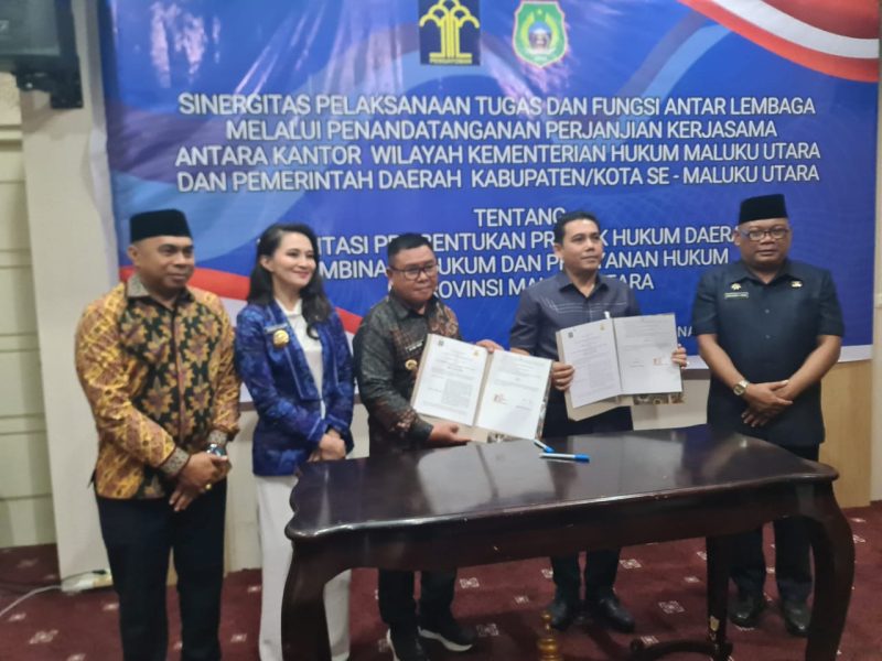TALIABU| MIMBARRAKYAT.CO.ID – Pemerintah Kabupaten (Pemkab) Pulau Taliabu dan Kantor Wilayah Kementerian Hukum dan Hak Asasi Manusia (Kemenkumham) Provinsi Maluku Utara (Malut) menandatangani Perjanjian Kerja Sama (PKS) di ruang kerja Wakil Gubernur Provinsi Maluku Utara. Sabtu (23/8/2025).