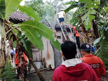Mereka bergotong royong membersihkan puing-puing atap rumah dan menyingkirkan pohon tumbang menggunakan mesin senso serta peralatan yang dibawa oleh BPBD.
