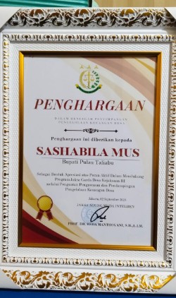 Penghargaan ini diberikan kepada Sashabila Widya L Mus, Bupati Pulau Taliabu sebagai bentuk apresiasi atas peran aktif dalam mendukung Program Jaksa Garda Desa Kejaksaan RI melalui penguatan pengawasan dan pendampingan pengelolaan keuangan desa.