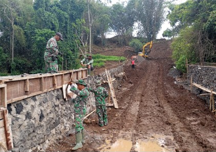 Sejak pagi, prajurit TNI bersama warga setempat tampak bahu-membahu mempercepat pembangunan talud di sepanjang jalan desa, Minggu (26/10/2025).