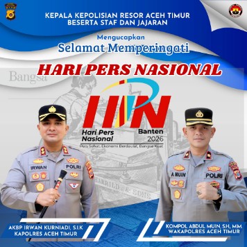 “Atas nama pimpinan dan seluruh anggota Polres Aceh Timur dan jajaran, saya mengucapkan Selamat Hari Pers Nasional 2026. Kami juga sangat mengharapkan masukan, kritik yang membangun, serta peran aktif insan pers dan tokoh masyarakat, agar Polri semakin mantap dalam meningkatkan kinerja dan pelayanan kepada masyarakat,” ujar AKBP Irwan Kurniadi, SIK, Senin  (09/02/2026).